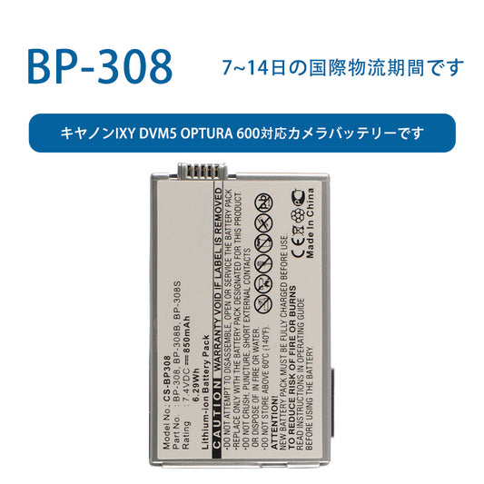 BP-308 ため キヤノンIXY DVM5 Optura 600カメラバッテリー7.4V 850mAh リチウムイオン電池 TLALOC ENERGY